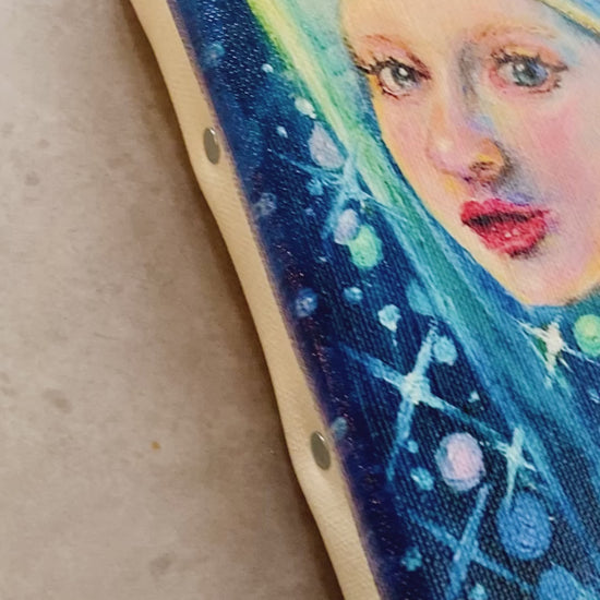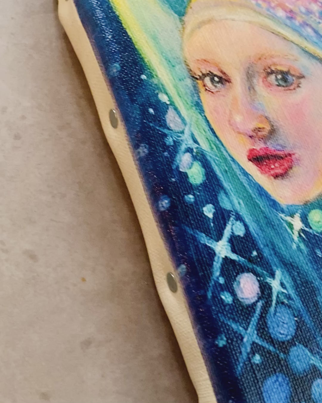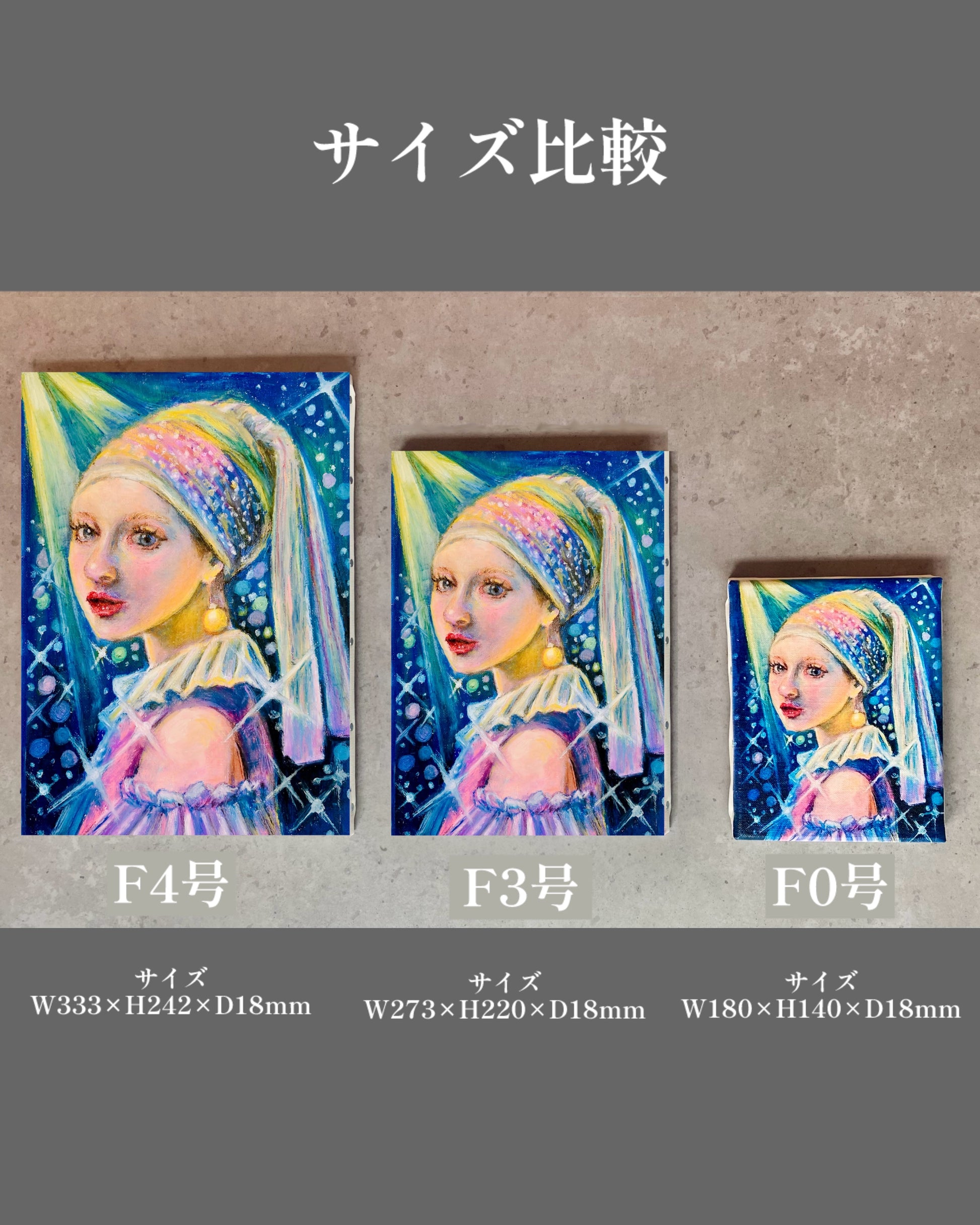 名画「真珠の耳飾りの少女」をベースに、オリジナルアレンジで描いた作品を高品質に複製したキャンバスアートです。原画と同じキャンバス素材に高画質で印刷しており、絵の質感や色の深みをしっかりと再現しています。